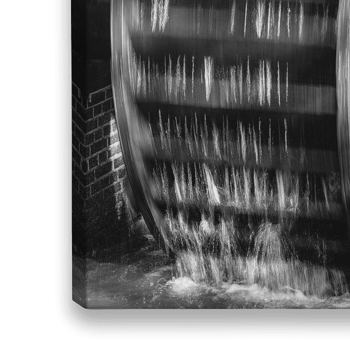 Ronddraaiende watermolen aan de rand van het dorpje Wilsum in Duitsland. Het rad beweegt een maalsteen en een karn. Foto in zwart-wit. Deze foto is gemaakt in Oktober 2025