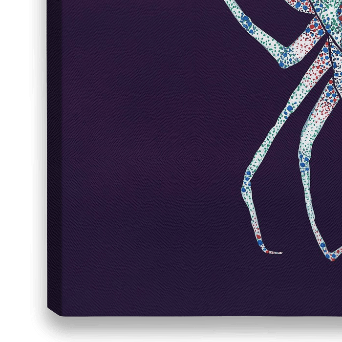 Een acryl inkt tekening van een witte spin met gekleurde stipjes. De spin is gebaseerd op een kruisspin. De segmenten van het spinnenlijf zijn los van elkaar. Door de pointillisme invulling lijkt de spin 3D. Hij hangt aan een draad