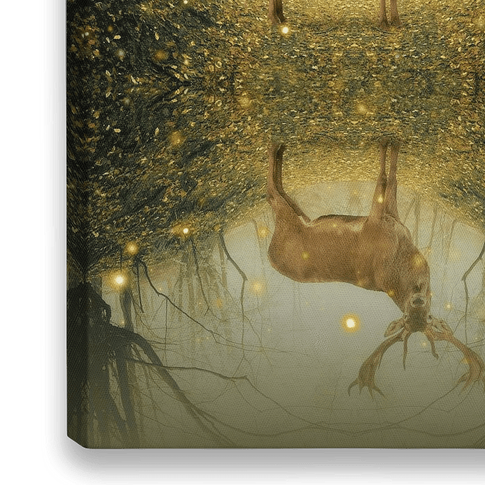 Dromerig fantasie - tafereel met een hert in een betoverd bos, zijn reflectie zichtbaar in het stilstaande water van een beekje.