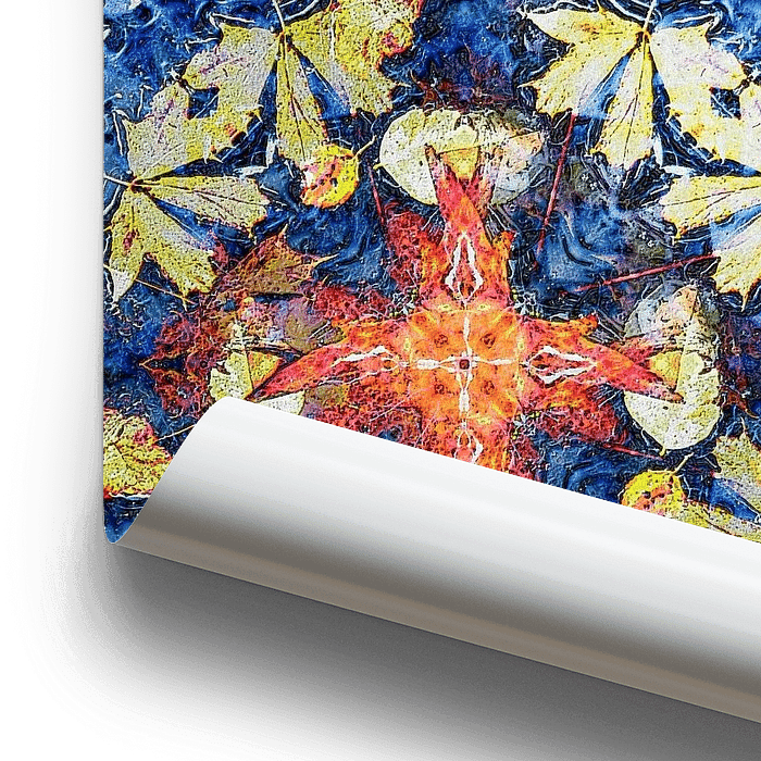 Een caleidoscopisch beeld dat door zijn kleur enigszins doet denken aan traditioneel Delfts blauw aardewerk, en dat gebaseerd is op een foto van bladeren drijvend in een vijver in de herfst.