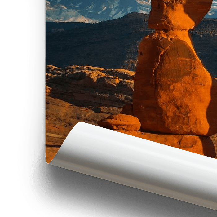 Delicate arch bij zonsondergang, in Arches National Park, Utah. Door de boog zijn de met sneeuw bedekte bergen te zien aan de horizon. Delicate Arch is een 16 meter hoge vrijstaande natuurlijke boog van zandsteen in het Arches National Park nabij Moab in de Amerikaanse staat Utah. De boog is niet te bereiken met de auto en om er te komen moet er een wandeling worden afgelegd van meer dan een uur. Delicate Arch is het meest beroemde monument uit het nationaal park en een belangrijk symbool voor de staat Utah.