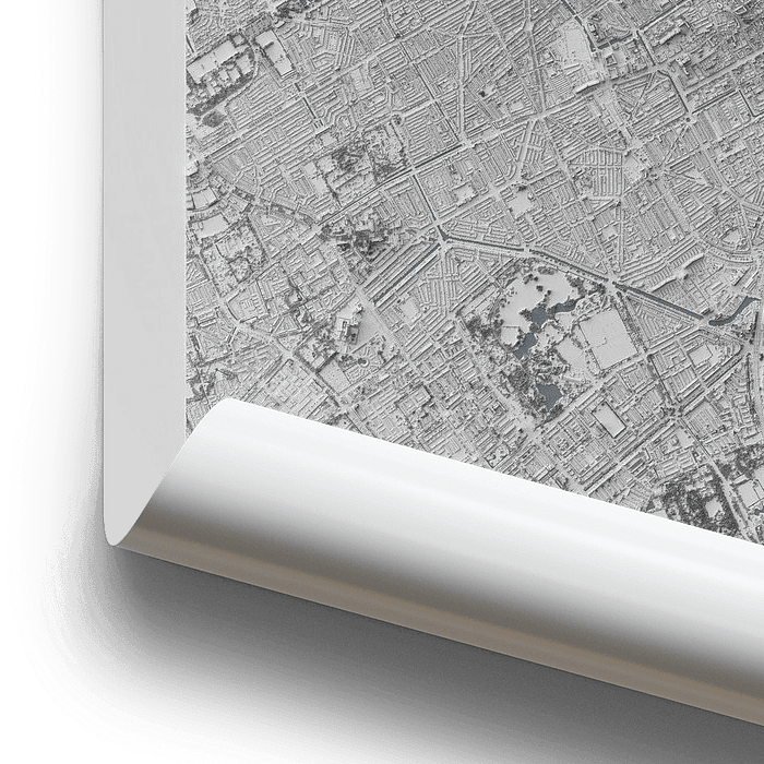 Een 3D reliëf plattegrond van Den Haag en Scheveningen. Goed zichtbaar is de geconcentreerde hoogbouw rondom het stationsgebied. Ook de duinen in het noorden zijn goed te onderscheiden.