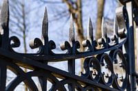 Afbeelding van een decoratieve ijzeren hek in Gotische stijl voor design achtergronden. Zwarte afrastering van metaal gedecoreerd door ambachtelijk smederij vakmanschap.