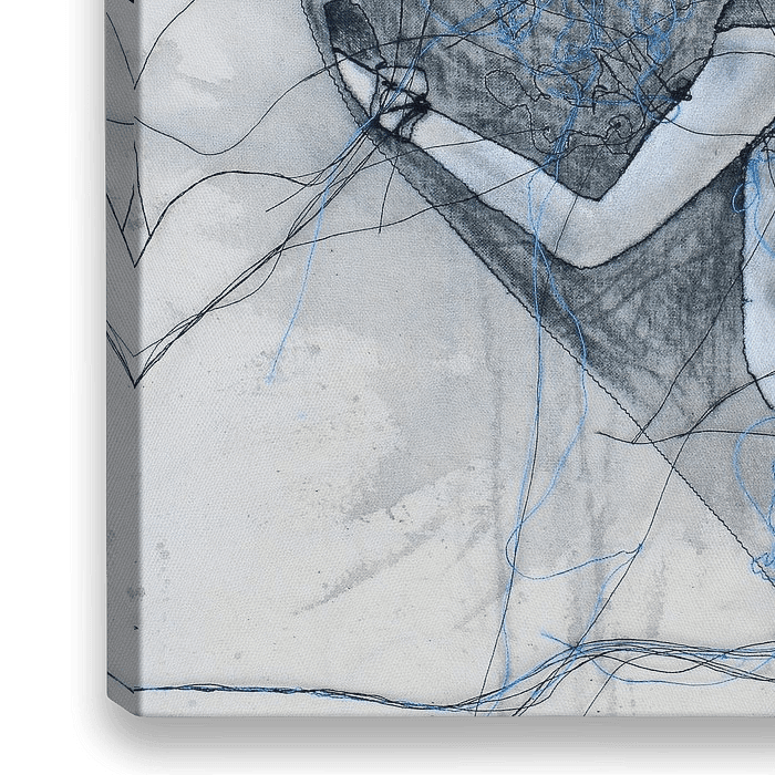 De draden geven beweging en draaien als het ware om het centrum heen. De beweging wordt versterkt door de dansende figuur.