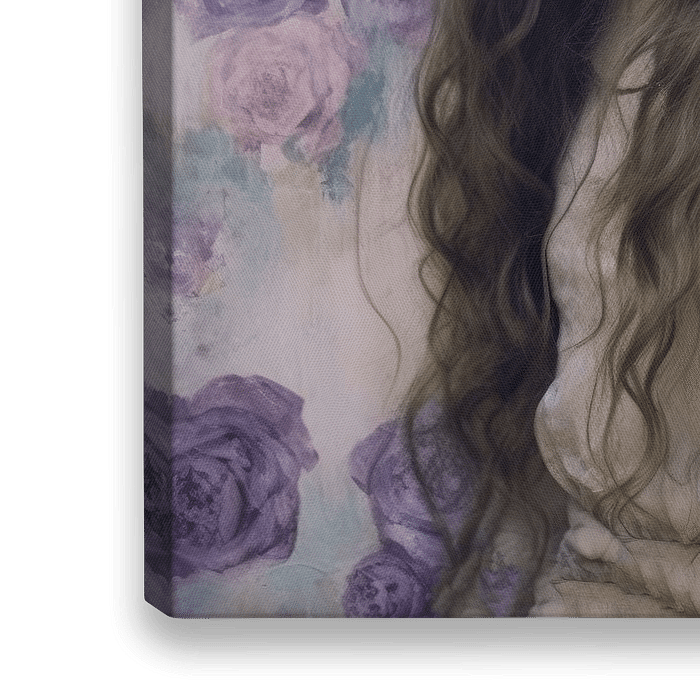 Digital art portret "Purple rose". Prachtig digitaal portret van een jonge vrouw met lang haar tegen een achtergrond met daarop paarse en lila rozen. Dit werk heeft een zachte en poëtische uitstraling.