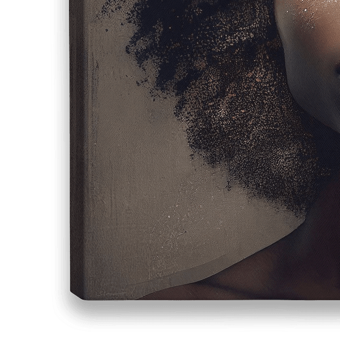 Digital art, realistisch portret "power woman". Portret van een zwarte vrouw met gesloten ogen, omringd door hele fijne korreltjes, tegen een geschilderde achtergrond in aardetinten.