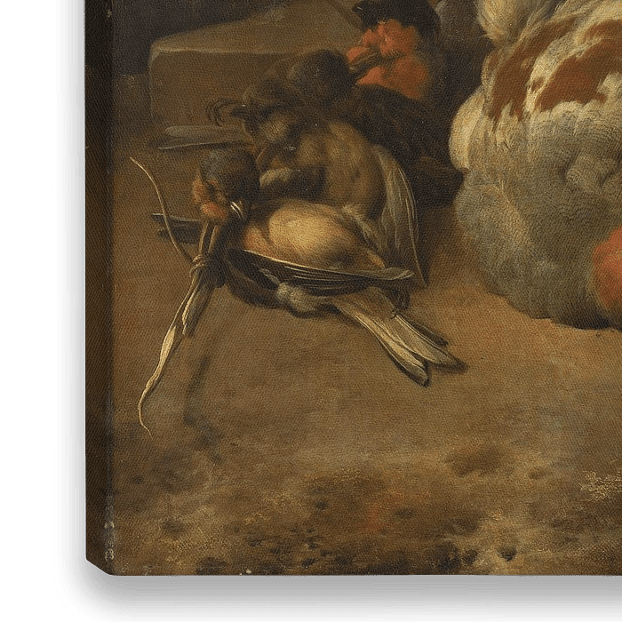 Een patrijs en, van boven naar beneden, liggen een goudvink, twee huismussen en een keep gebonden aan een tak tegen een stenen plint waarop een omgevallen console van een antieke ruïne staat.