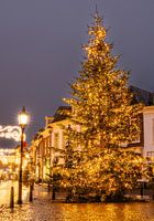 portret van het centrum van Doesburg tijdens de kerstperiode, met zicht op een mooi verlichte winkelstraat, een straatlantaarn en een gigantische kerstboom