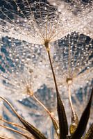 "Door de pluizenbol heen" is een macrofoto van waterdruppels op zaadpluisjes van schuin onderaf gefotografeerd in een pluizenbol. Deze bewerkte foto heeft wit / creme tinten, bruin / beige / goud tinten en heeft een blauwe achtergrond die verloopt van licht blauw naar donker blauw..