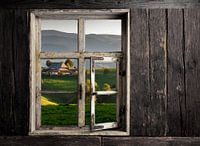 rustieke boerenwoning met uitzicht door een houten raam in het landschap, studio-opname