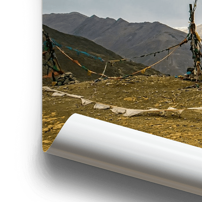 Dramatische hemel in de vallei der koningen, Tibet. In de vallei zijn nog graven en tempels van vroegere koningen van Tibet. Hier zie je de regen in de lucht hangen en in de verte de sneeuw op de bergen liggen. De gebedsvlaggen zijn versleten door de harde wind op de top van de heuvels.