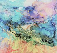 Impressie met alcohol inkt van mijn droom van de zee. De golven zijn in diverse pasteltinten blauw, groen en roze met wat goud. De groene tint is als zeewier dat zwierig mee spoelt. Net als de kleuren van de zee lopen ook de kleuren van de inkt door elkaar en geven zo een fascinerend beeld.