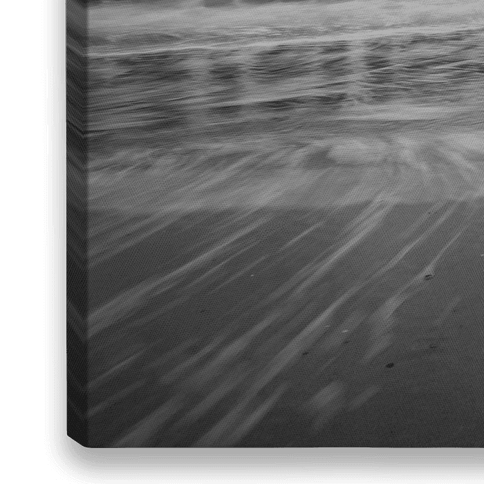 Foto van strand met palen gefotografeerd met een lange sluitertijd en in zwart/wit.