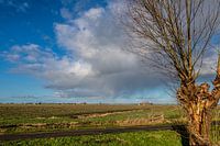 Landschap in Drente met een regenbui in de verte en de typisch Nederlandse treurwilg in beeld .