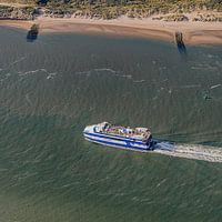 Veerboot m.s. Vlieland nadert haar thuishaven Vlieland, aanvarend over de Vlieree ter hoogte van de jachthaven.