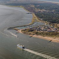 Veerboot m.s. Vlieland nadert haar thuishaven Vlieland, aanvarend over de Vlieree ter hoogte van de jachthaven.