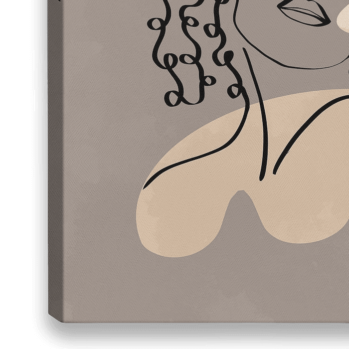 Minimalistische lijn tekening van een vrouwelijk gezicht met lang krullend haar, getekend met zwarte inkt. Drie organische vormen in de kleuren van een vale winterse zon zijn geplaatst op een achtergrond in grijs. De achtergrond en de vormen zijn met aquarelverf geschilderd met een typische textuur.