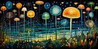 Dromende Kwallen is een digitaal schilderij van omhoogdrijvende abstracte kwallen. De levendige kleuren en details van het werk prikkelen de zintuigen en brengen leven in elke kamer.