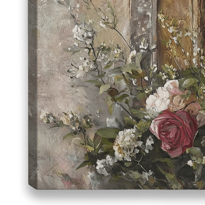 Dromerige Vrouwenblik - Dit vrouwenportret schilderij toont een jonge vrouw met een dromerige blik, haar gezicht sereen omgeven door wild bloemige motieven, waarbij de delicate, gedetailleerde textuur van haar kleding en het bloemstuk in haar haar rijk aan kleur zijn, tegen een zacht, impressionistisch achtergrond.