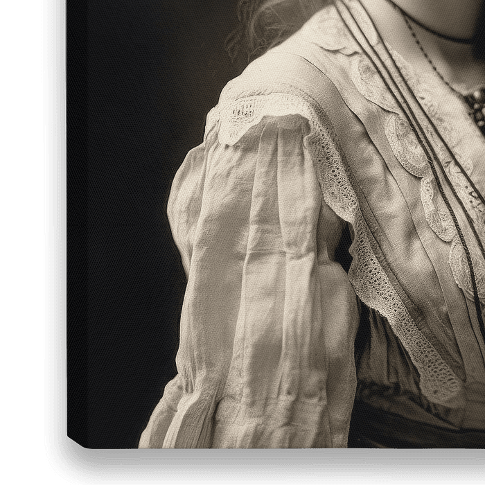 Dit portret vangt op indrukwekkende wijze het dromerige aura van de afgebeelde vrouw. Haar wilde en weerbarstige haar geeft haar een natuurlijke, bijna mystieke uitstraling. De onregelmatige krullen omlijsten haar gezicht en vormen een dynamisch contrast met haar kalme en bedachtzame uitdrukking. Haar blik is zacht maar doordringend,…