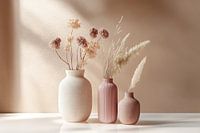 Deze serene compositie toont drie vazen met gedroogde veldbloemen en pluimen, zorgvuldig gerangschikt tegen een zachtbeige achtergrond. De sobere tinten en eenvoudige vormen creëren een gevoel van rust en verstilling. De vergankelijke schoonheid van de gedroogde bloemen symboliseert de vluchtigheid van het leven en nodigt uit tot…