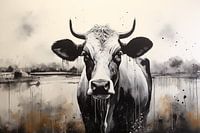 Dit kunstwerk toont een indrukwekkende koe, prominent op de voorgrond, met een intens en nieuwsgierig oog dat de toeschouwer lijkt te observeren. Het kleurenpalet van deze creatie is voornamelijk monochroom, wat een sterk contrast biedt tussen het spierwitte gezicht van de koe en de inktzwarte vlekken die zowel haar vacht als de…