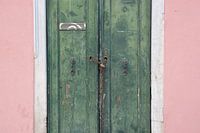 Koop de foto Dubbele groene deur op een roze muur, Venetië van Danielle Roeleveld als print op canvas, aluminium dibond, (ingelijste) fotoprint, behang en ArtFrame. Voor jou op maat geprint in Fine-Art kwaliteit.