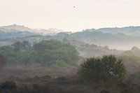 Duingebied Berkheide tussen Katwijk en Wassenaar. Ochtend met mist bij opkomende zon. Hollandse Duinen van nationaal park Hollands Duin. Sfeervol landschap gefotografeerd in de vroege ochtend.