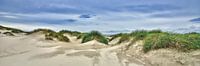 Een panorama beeld van het duinlandschap in de herfst. Tussen het helmgras nog een stukje te zien van de Noordzee.
