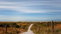 Een kunstzinnige foto van een duinpad naar het strand en de zee op Schiermonnikoog. Het pad leidt de kijker naar de achtergrond van de foto waar het strand en de zee zichtbaar zijn, maar bovenal een lucht waar de wolken zich als vegen laten zien.