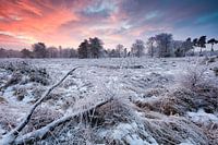 Dwingelderveld Nationaal park in Drenthe in de winter met sneeuw en een mooie avondrode lucht aan het einde van een koude winterdag.