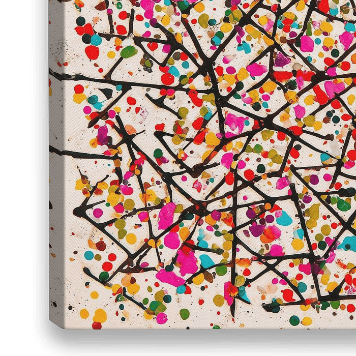 Een levendig abstract expressionistisch schilderij met een dynamisch samenspel van chaotische lijnen en levendige kleurspatten, chaotisch verspreid over het hele oppervlak. De compositie is energiek en spontaan wat een gevoel van beweging en levendigheid oproept.
