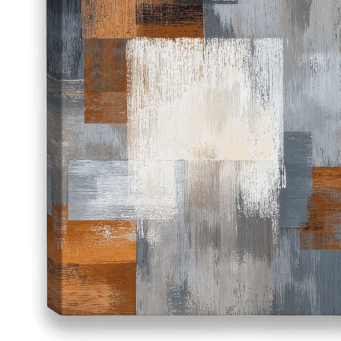 Een modern abstract schilderij met een geometrische compositie van rechthoekige en vierkante blokken uitgevoerd in ruwe gestructureerde penseelstreken. De blokken zijn gelaagd en overlappend gerangschikt, wat een gevoel van diepte en complexiteit creëert.