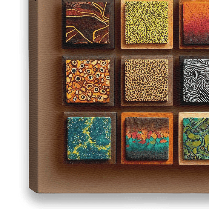 Een abstract kunstwerk samengesteld uit een collectie van kleine vierkante schilderijtjes met lijst. Elk doek toont een unieke abstracte compositie met een verscheidenheid aan kleuren, texturen en penseelstreken. De algehele indruk is een levendig en dynamisch mozaïek van abstracte kunst. De verzameling doeken vormt een visueel rijk en…