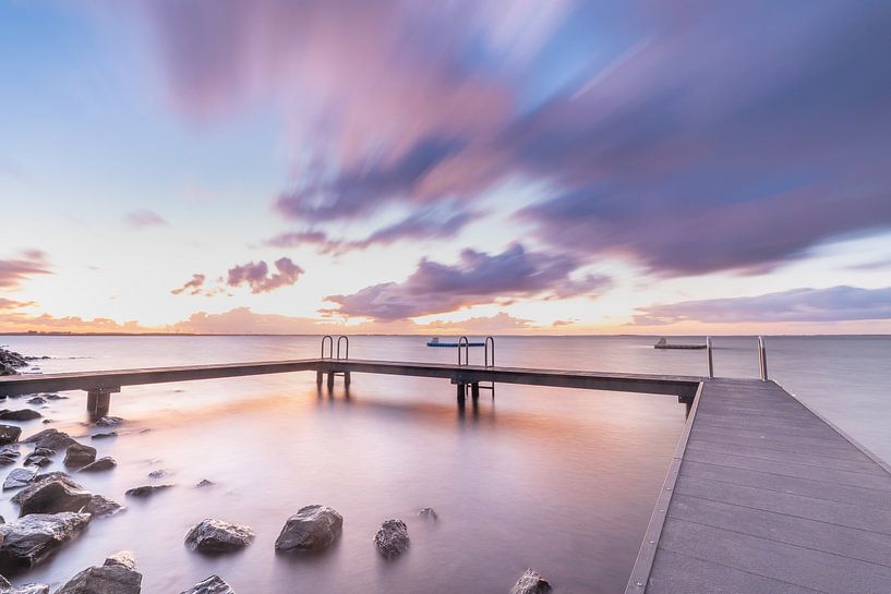 Een dynamische start van de dag bij de zwemsteiger in Ouddorp. De lange sluitertijd, de rust in het water en beweging in de wolken zorgen voor een beeld dat mooi in balans is. Op deze plek word je in de ochtend vaak vergezeld door zwemmers, maar deze ochtend was het heerlijk rustig.