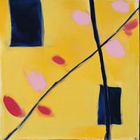 abstracte compositie met een dominant gele achtergrond, doorsneden door dunne, zwarte lijnen die een rasterpatroon vormen. Binnen dit raster zijn rechthoekige vormen te zien in verschillende kleuren, waaronder donkerblauw en lichtroze. Deze vormen zijn ongelijkmatig verdeeld over het doek, wat bijdraagt aan een gevoel van speelsheid en dynamiek.