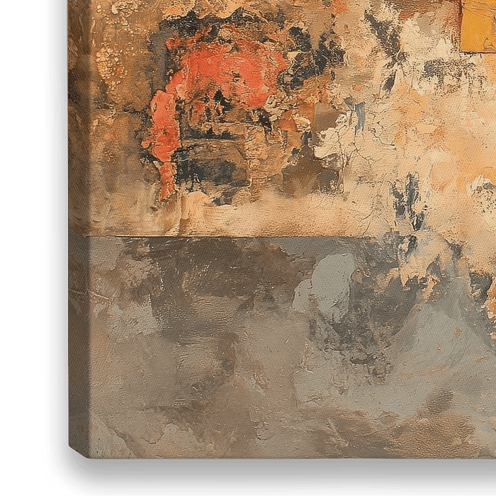 Een abstract schilderij met een dynamische compositie van rechthoekige vormen en blokken die overlappen en een kleurenpalet dat gedomineerd wordt door warme en aardse tinten. De textuur is rijk en gelaagd met zichtbare penseelstreken en een mix van gladde en ruwe oppervlakken, wat diepte creëert. De achtergrond heeft een mix van zachte…