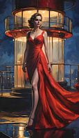 In dit betoverende digitaal impressionistisch kunstwerk wordt de gratie en elegantie van een jonge vrouw in een rode avondjurk vastgelegd, terwijl ze badend is in het zachte licht van een vuurtorenlamp die vlak achter haar schijnt. Het werk, getiteld "Eclipsed Elegance: In de Schijnwerper van de Zee", wekt een gevoel van mysterie,…