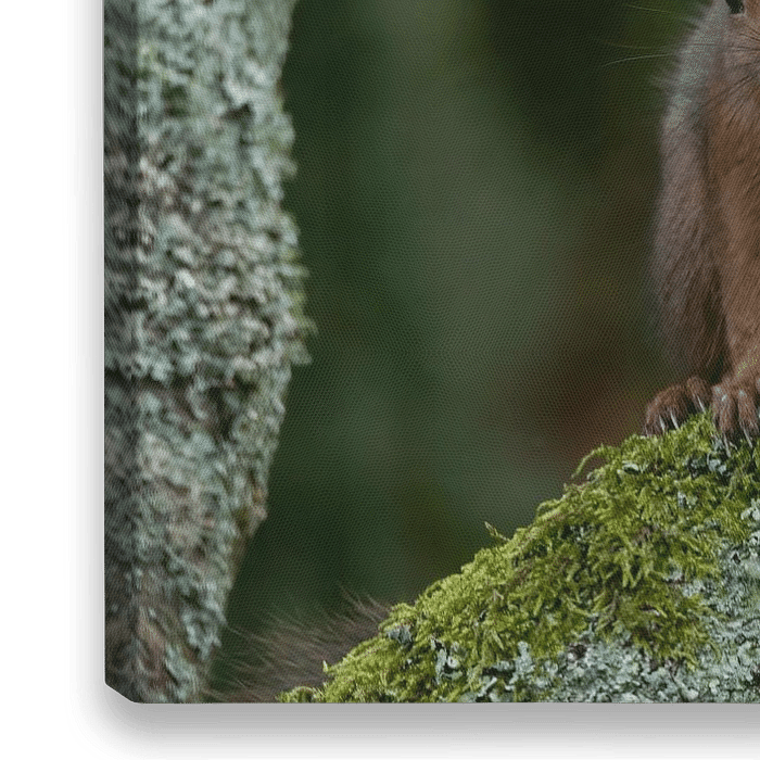 Breng de rust van het bos in huis met deze prachtige natuurfoto van een nieuwsgierige roodbruine eekhoorn. Het dier zit sierlijk op een met mos begroeide tak, omringd door subtiele details zoals boomschors, korstmossen en zwammetjes. De zachte, onscherpe achtergrond zorgt ervoor dat de eekhoorn direct in het oog springt.