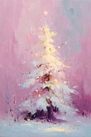 Een kunstwerk waar een verlichte kerstboom zich verheft uit een zachte sneeuwlaag, omgeven door een dromige roze en paarse sfeer. Met elegante verfstreken en sprankelende lichteffecten creëert dit werk een sfeer van weemoedige schoonheid en serene magie, waar moderne abstractie en traditionele warmte elkaar ontmoeten in een…