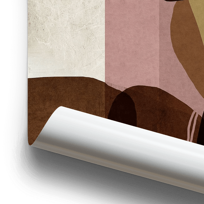 Abstract minimalistisch kunstwerk met geometrische vormen, gemoduleerde lijnen en tinten donkergrijs, roze en bruin.