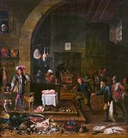 Koop Een groot paleiskeukeninterieur, met een valkenier die terugkeert van de jacht, David Teniers de Jonge als reproductie op canvas, aluminium dibond, (ingelijste) fotoprint, behang en ArtFrame, op maat geprint in Fine-Art kwaliteit.