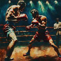 In een uitbarsting van levendige rode en blauwe tinten toont het schilderij twee boksers die in een intens gevecht verwikkeld zijn. De dynamische penseelstreken brengen de scène tot leven, waardoor de kijker bijna het geluid van botsende vuisten hoort en de adrenaline door de aderen van de boksers voelt stromen. Elke spier en pees is…