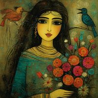 In dit adembenemende impressionistische schilderij zit een jong meisje met lang, golvend haar gracieus in een weelderige weide. Haar heldere, golvende jurk is een waterval van pasteltinten die harmonieus samengaan met de levendige omgeving. De weide leeft met een explosie van kleuren, van het levendige groen van het gras tot het aardse…