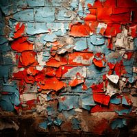 Deze foto toont een complexe compositie waarin felle kleuren de ruwe textuur van de muur in beeld brengen. De afbladderende kleurlaag in levendige rood- en blauwtinten geeft de bakstenen muur een dramatisch, bijna chaotisch uiterlijk. De levendige textuur suggereert dat de tijd zijn sporen heeft nagelaten, waarbij de ooit perfect…