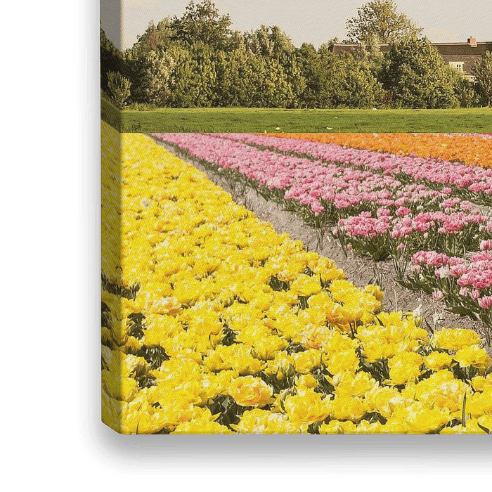 Een echt Hollands landschap met bloeiende tulpen, een windmolen en Hollandse wolkenlucht