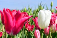 Koop dit bloemen kunstwerk Een witte tulp tussen de rode tulpen van Gerard de Zwaan als print op canvas, aluminium dibond, (ingelijste) fotoprint, behang en ArtFrame. Voor jou op maat geprint in Fine-Art kwaliteit.