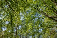 Foto gemaakt tijdens een boswandeling in de lente. Het blad is nog frisgroen en doorschijnend. De jonge boomblaadjes lichten op in de zon. Er staan veel beuken in het bos maar ook eiken en naaldbomen.