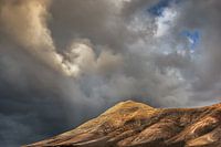 Het vulkaanlandschap op het Spaans Canarische eiland Lanzarote heeft grillige en glooiende vormen. Op de foto het gebied bij het stadje Yaiza met een stevig wolkendek met een kleine opening die het hoogste punt precies in het zonlicht zet.