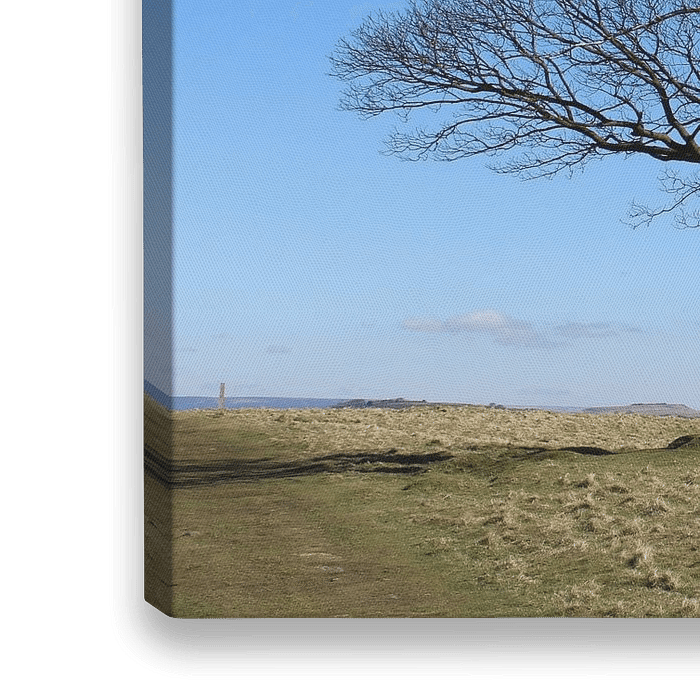 Een mooie eenzame loofboom, tegen een achtergrond van blauwe lucht en het natuurlijke landschap van open heide en heuvels, in het Peak District, in Derbyshire in het noordwesten van Engeland.